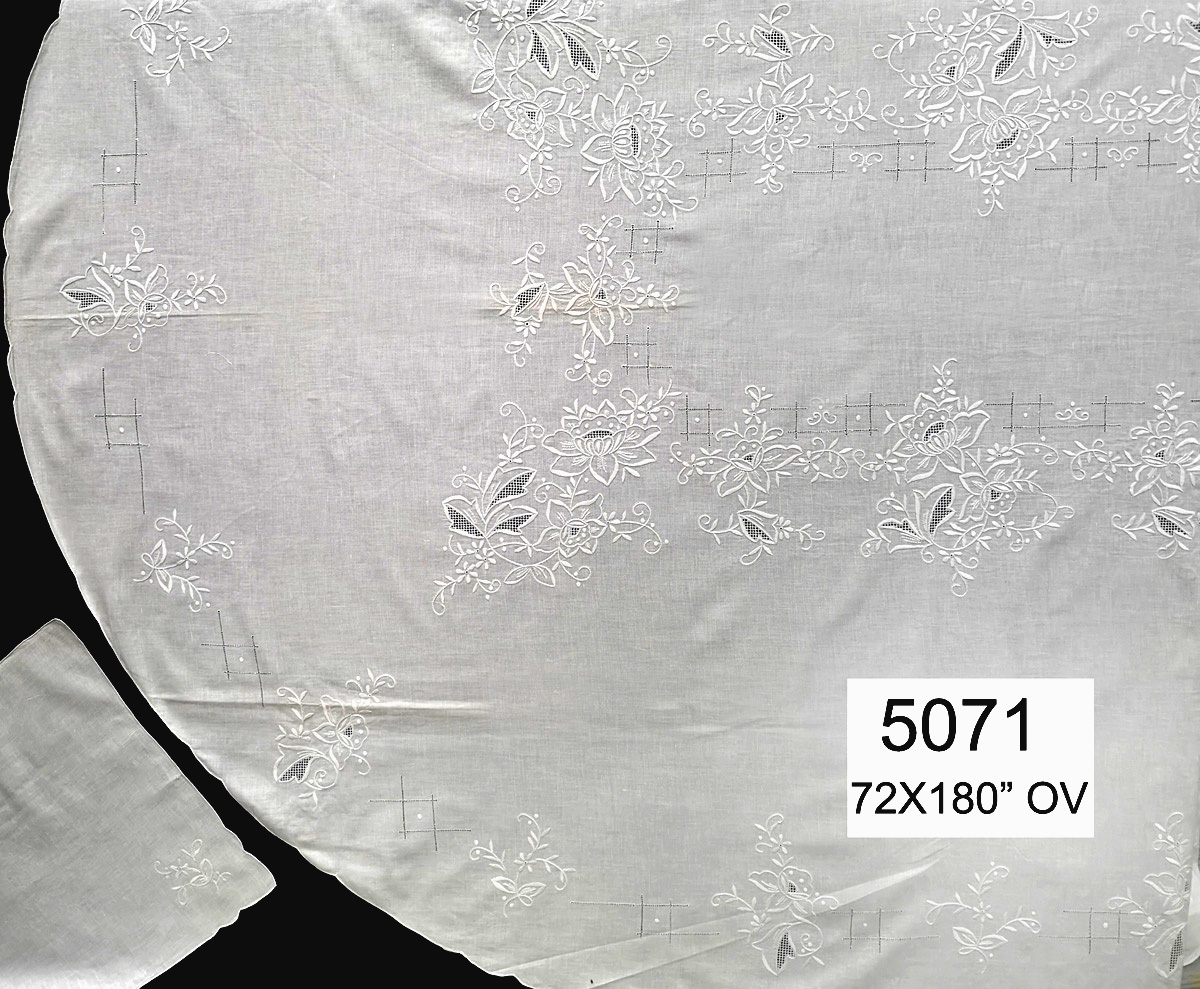 5071 72X180" OVAL White linen with white hand embroidery tablecloth