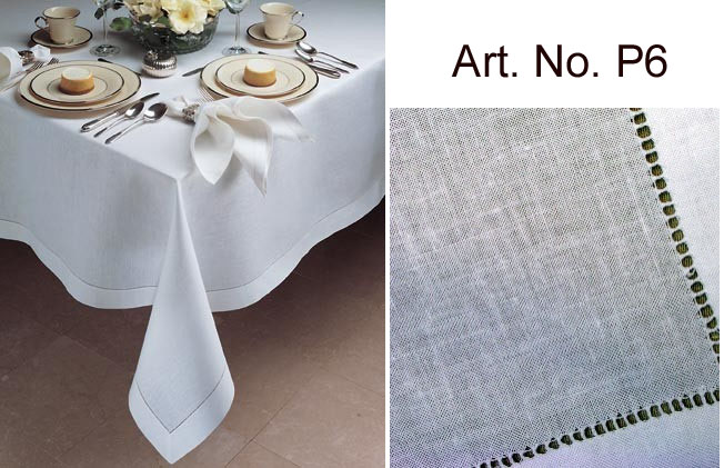 P6 White linen with hemstitch embroidery tablecloths Matching napkins with 1" hemstitch embroidery border are available in 18"X18" and also available in 12x12"