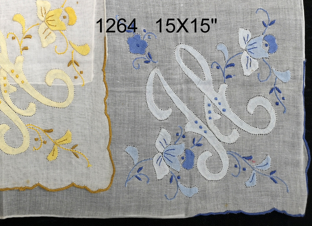 1264C 15X15" White fine cotton with color hand embroidery initial handkerchiefs Each dozen consist of blue, pink & yellow embroidery equally assorted Initial available : A, H, G,